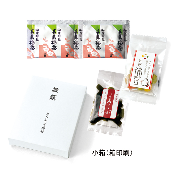 縁起のいい御神饌三種をセットにさせていただきました。「長寿梅茶」「五色福豆」「よろこぶ」は、それぞれ<延命長寿・百福迎祥・よろこぶ心>を祈願します。季節やご神事の内容を問わず幅広い用途にお使いいただきやすいのが人気の理由です。三つの味が一度に楽しめるので、老若男女を問わずお喜びいただける御神饌です。小箱入りはコンパクトで持ち帰りやすく、他の御神饌や御札等と合わせてもお使いいただきやすいサイズです。